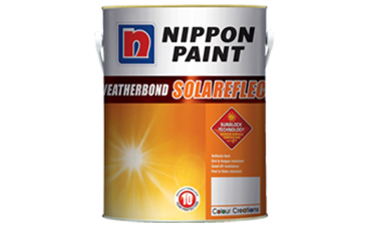 NIPPON WEATHERBOND SOLAREFLECT adalah cat berbahan dasar 100% akrilik yang tidak ditambah dengan timbal dan merkuri. Cat ini di formulasikan khusus untuk melindungi permukaan dinding luar dari cuaca ekstrim di Indonesia. Cat ini juga memberikan perlindungan yang kuat untuk membantu warna cat agar tidak menjadi pudar yang disebabkan oleh cahaya matahari, kotoran, dan lumut,Dengan formulasi inovatif “Sunblock Technology” yang dapat mengurangi suhu permukaan sampai 5°C, rumah menjadi sejuk dan membantu menghemat energi